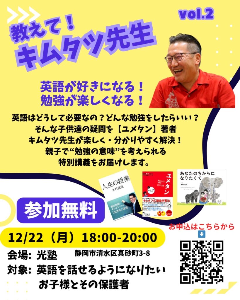 この冬、光塾に再びビッグゲストがやってきます! ベストセラー単語集『ユメタン』の著者であり、全国で活躍する**キムタツ先生(木村達哉先生)**による特別授業の第2弾です。